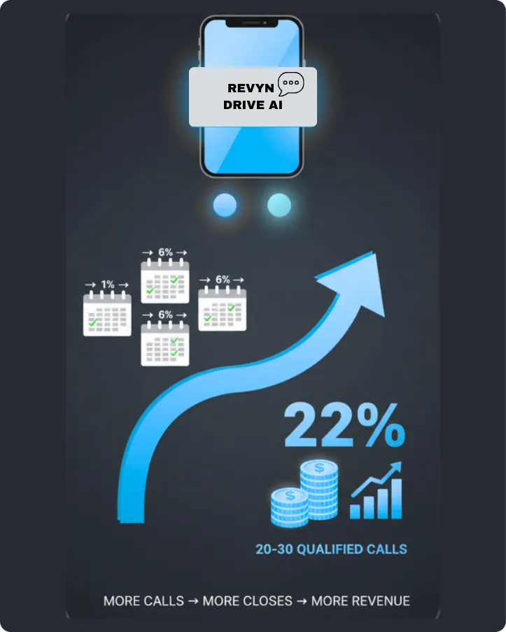 Let’s talk numbers. Traditional outreach might scrape together 1% call bookings. Human reps can push it to 6%. Revyn Drive consistently delivers up to 22% (from the exact same leads).